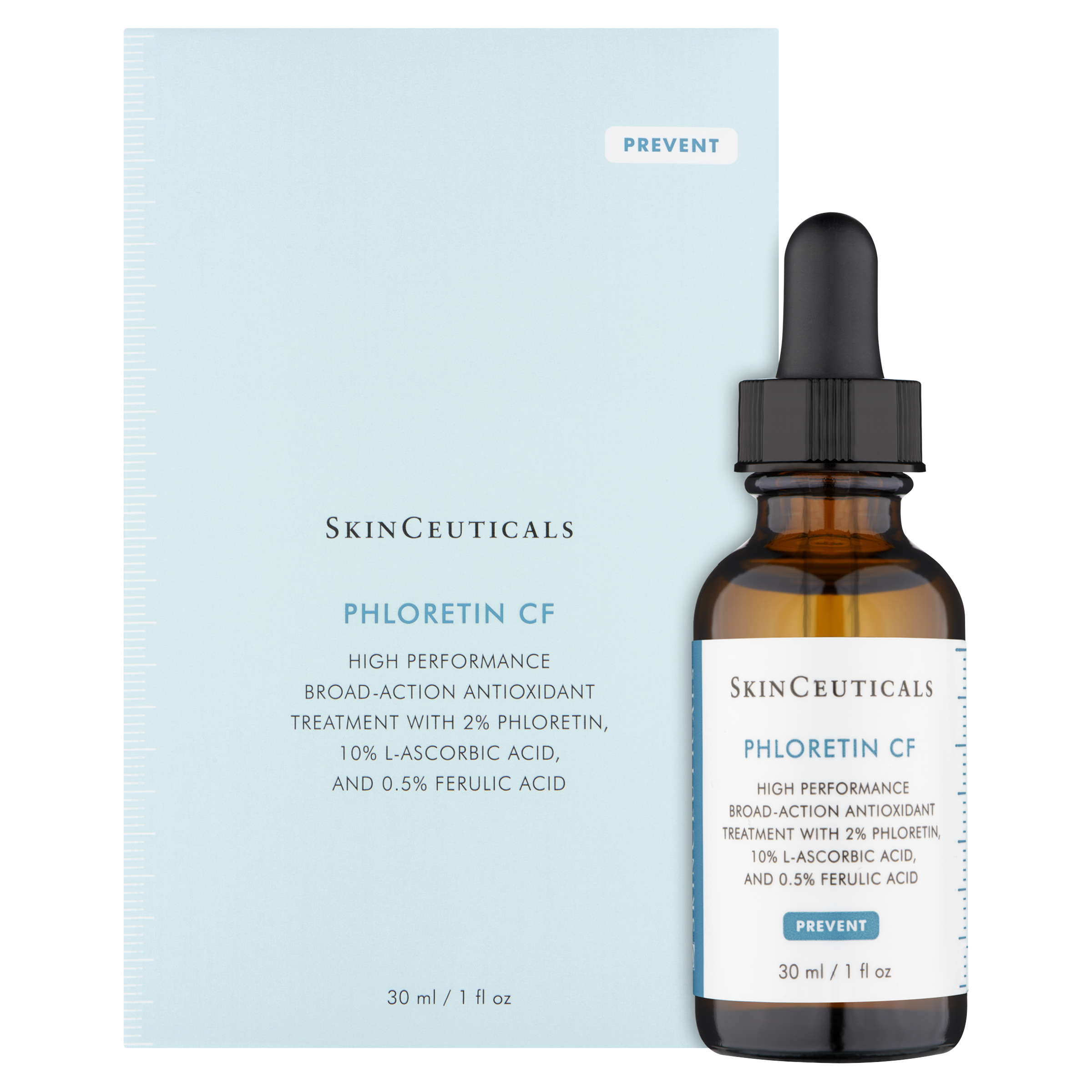 With a synergistic combination of potent antioxidants - Phloretin, pure vitamin C (L-ascorbic acid), and ferulic acid - Phloretin CF is formulated according to the Duke Antioxidant patent. This ensures effective delivery of vitamin C to the skin. In order for our topical vitamin C to be effective it must be formulated with pure l-ascorbic acid (vitamin C) at an acidic pH within the 2.0-3.5 pH range and have a concentration between 10-20%. SkinCeuticals is the only brand to formulate according to these parameters